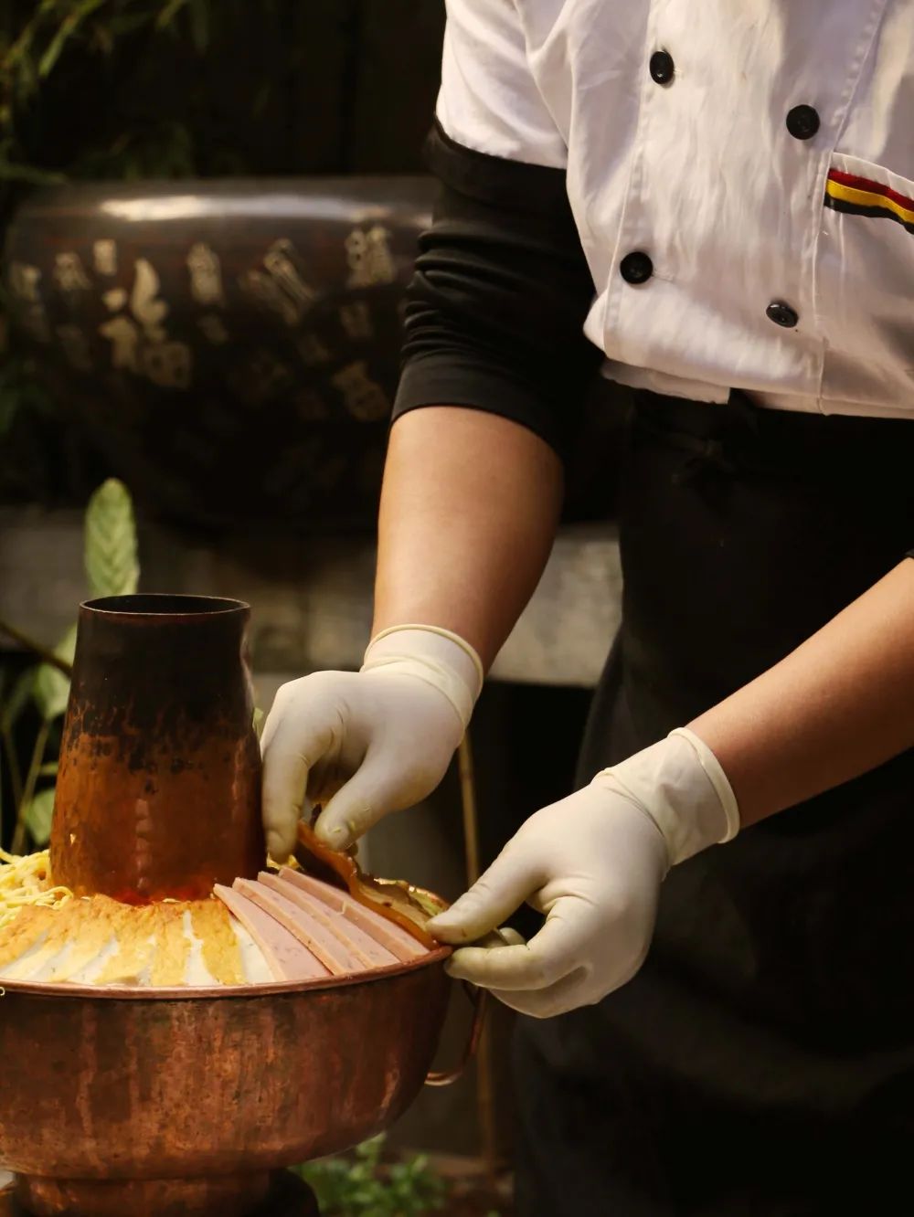 后来,铜炊锅流传到民间后,经不断改良演变成了现在的样子。善于做美食的建水人利用这一炊具,装入各种新鲜食材后,改涮食为焖煮,把食用美食的过程精炼成了“铺炊”“烧炊”“吃炊”三个步骤,将铜炊锅的使用功能发挥到了极致。