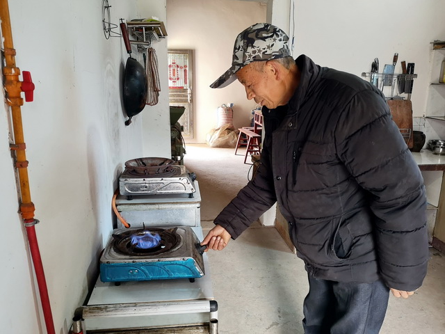 仪陇县双胜镇新民村村民许家全向记者介绍沼气灶具使用情况。摄影/章轲
