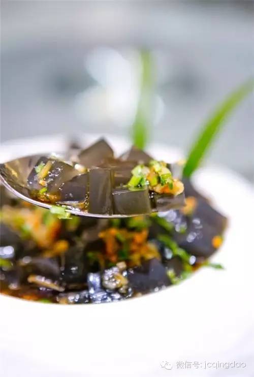 特色黑凉粉。青岛石花菜熬制,加入墨鱼汁制作而成。
