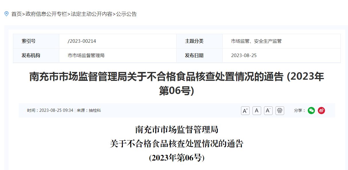 南充市市场监督管理局关于不合格食品核查处置情况的通告(2023年第06号)