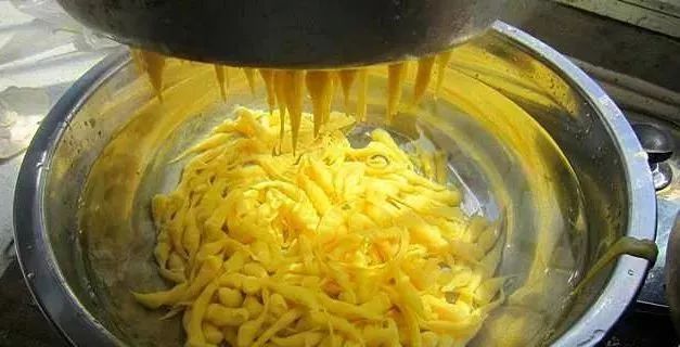 高担酿皮的制作和普通酿皮稍有差异,主要是蒸制过程中不加入食碱,不提取面筋,所以柔劲较强。用面粉加水搅拌均匀上笼屉蒸熟,取出食用时用刀切成条状,调上油泼辣子、醋、香油、芝麻酱、醋、芥末、蒜泥、秘制调料即可食用。