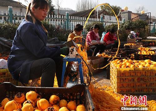 资料图:陕西省陇县天城镇范家营村农户正在采摘柿子,进行柿饼深加工。2017年在当地政府扶贫干部帮助下,该村以合作社加农户方式,正在以采摘、深加工、销售一条龙服务模式脱贫。 中新社记者 宋吉河 摄