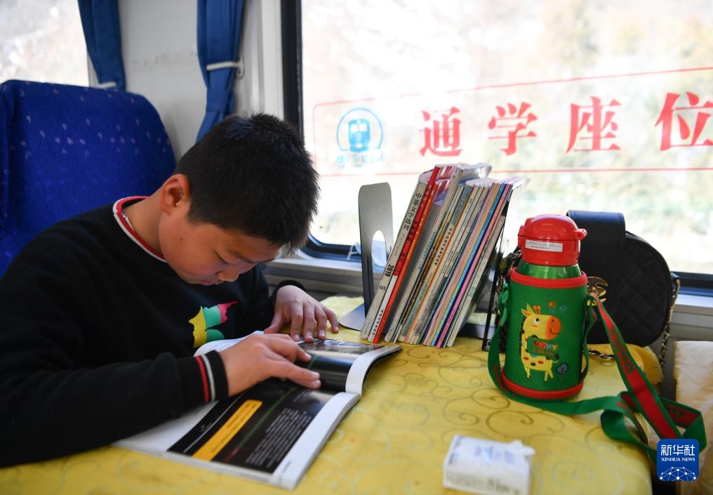 1月28日,一位学生在公益“慢火车”6063次列车上的通学座位阅读书籍。