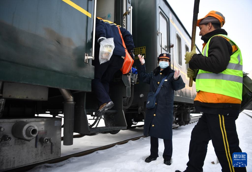 1月28日,中国铁路西安局集团有限公司宝鸡工务段职工携带餐食登上列车准备前往工作区域进行除冰巡查。