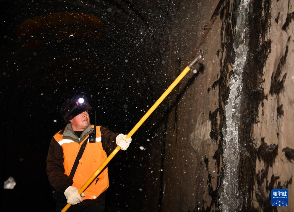 1月28日,中国铁路西安局集团有限公司宝鸡工务段隧道打冰队职工在宝成铁路神砂河3号隧道进行除冰作业。