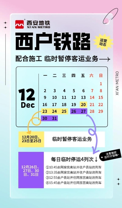 西户铁路将于12月20日、23日、24日、25日暂停客运服务。同时,西户铁路将于12月26日、27日、30日、31日每日停运4列次(分别为10:45、13:35由阿房宫南站开往户县站的列车,12:55、15:45由户县站开往阿房宫南站的列车)温馨提示,有出行计划的市民请提前做好交通规划。