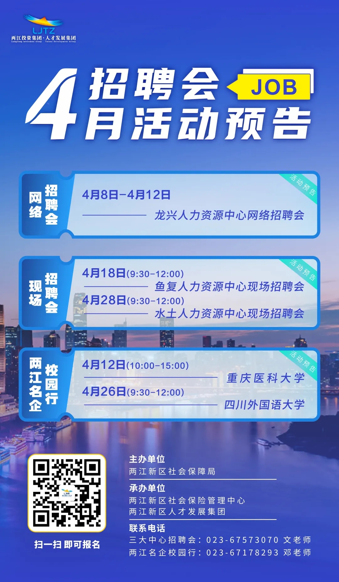为进一步为企业和求职者搭建平台,助力企业招聘,帮助劳动者就业,两江新区4月招聘会活动持续来袭,5场招聘活动,线上线下齐开展,超多岗位等你挑!