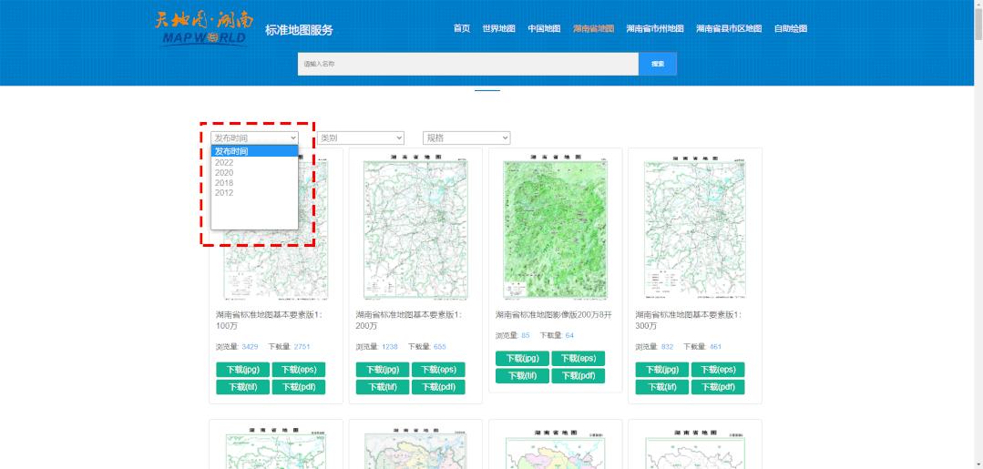 在平台“标准地图”模块,湖南省地图、湖南省市州地图、湖南省县市区地图三个页面新增标准地图分类查询功能。通过选择地图发布时间、类别、规格等分类属性,实现标准地图的查询检索,可直观浏览相应标准地图,迅速筛选出对应不同年份、不同类别、不同开本的地图,方便公众快速找到所需,选择想要的标准地图一键下载。