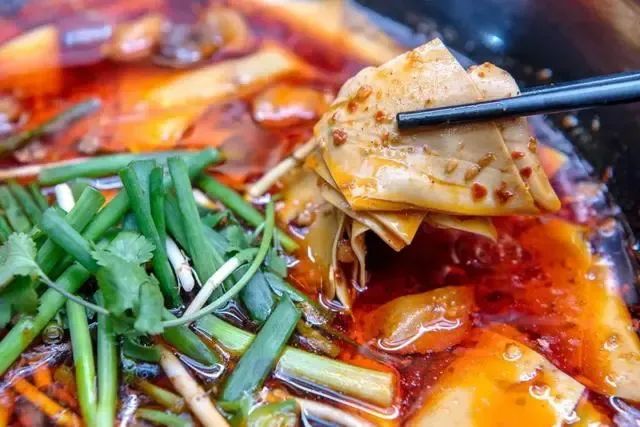 纯手工制作的豆腐皮,皮薄不粘、筋丝好,配上麻辣锅底,够劲!汤面上一层厚厚的红油,只能看到豆腐皮与飘在最上面的葱花、香菜,麻辣刺激,豆香四溢。