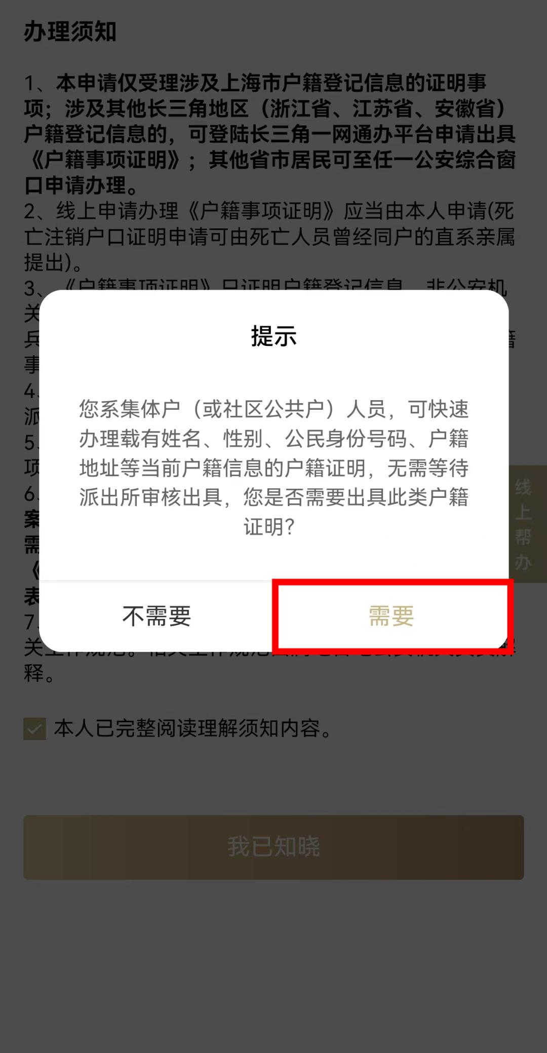 1、搜索“户籍事项证明点击进入,进入后弹出“您系集体户......”提示,点击“需要”