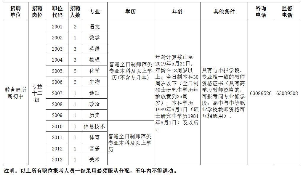 2、初中教师20名:语文2名、数学1名、英语3名、物理3名、化学2名、生物2名、地理1名、政治1名、历史1名、体育1名、音乐1名、美术1名、信息技术1名。