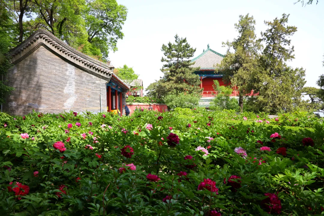 绽放在浓浓绿意与戒台寺的红墙青瓦间
