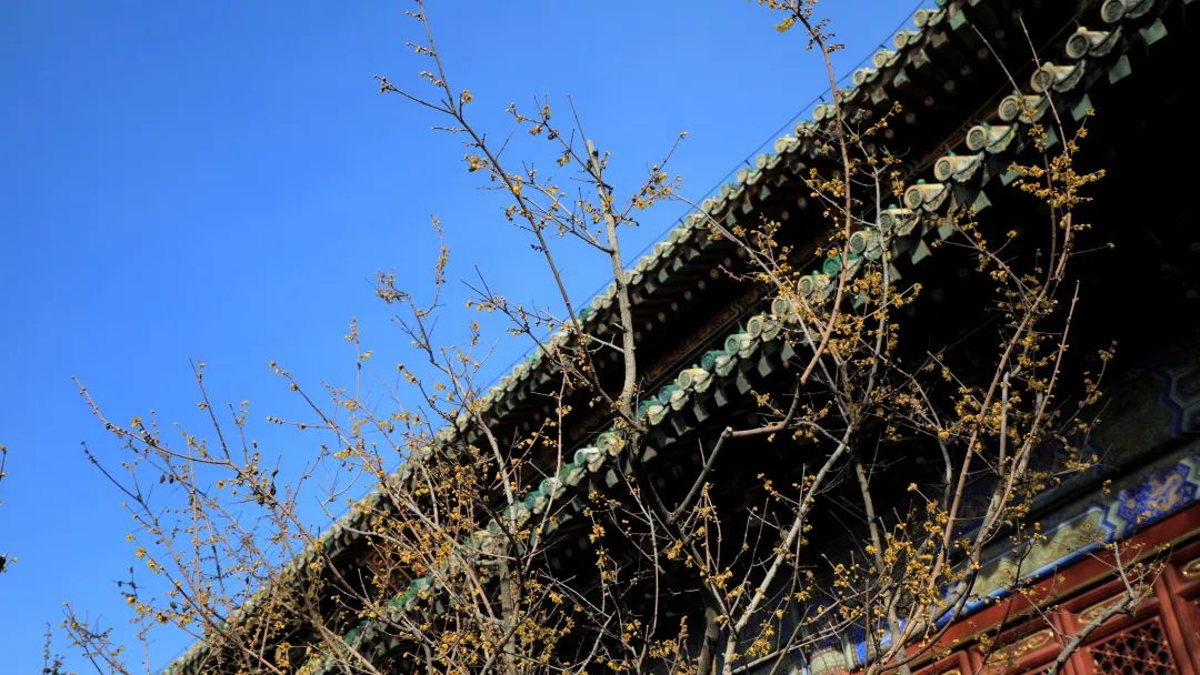 腊梅与古寺的红墙青瓦相互映衬