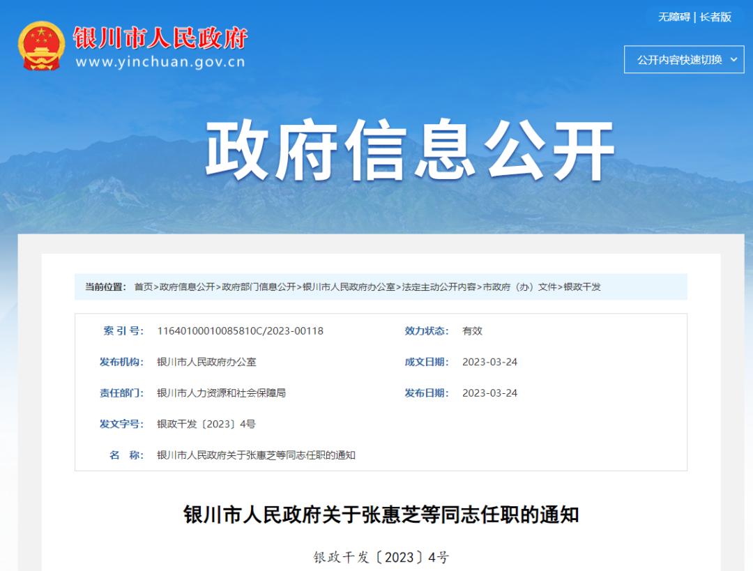按照《银川市党政领导干部任职试用期暂行规定》《宁夏回族自治区公务员调任实施办法》《宁夏回族自治区事业单位领导人员管理暂行办法》有关规定,张惠芝等同志任职试用期已满,决定正式任命: