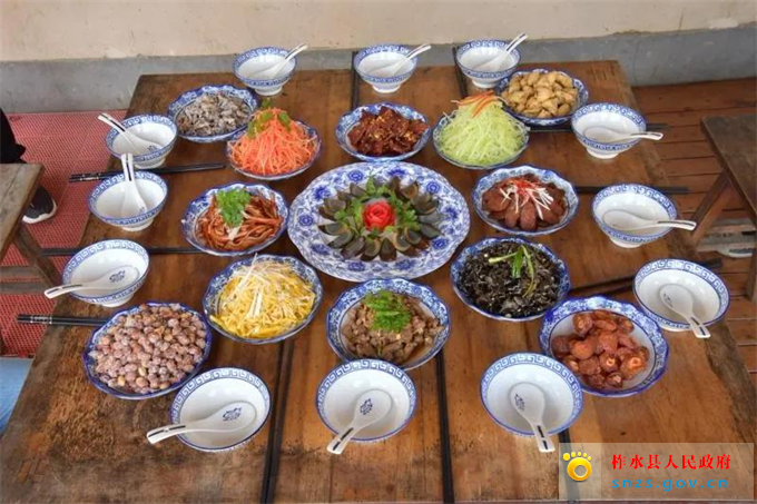 主要流行于乾佑河、社川河流域,是十三花、三台席等菜系的基本结构形式。相传“八仙”过海时,经终南山后,见乾佑河谷地云烟氤氳,绿意盎然,一改漠北之荒凉,便按下云头,化作百姓。但见百姓生活清苦、饮食粗疏,便在四周山上采来可食的樁芽、木耳、香菇等山珍,将各种荤素菜配以煎、煮、烹、炸、炒、调,大食四乡八邻百姓。百姓便以此招待来宾、祭祀节日。
