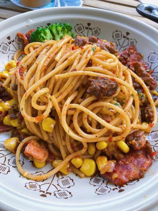 来这里,只为吃一吃它店里特有的湘味意面。培根牛肉裹上辣椒粒被煎的焦香,但肉质却仍然滑嫩。带孜然味的意面一口气缩进嘴里,这个湘味,只有这里有。