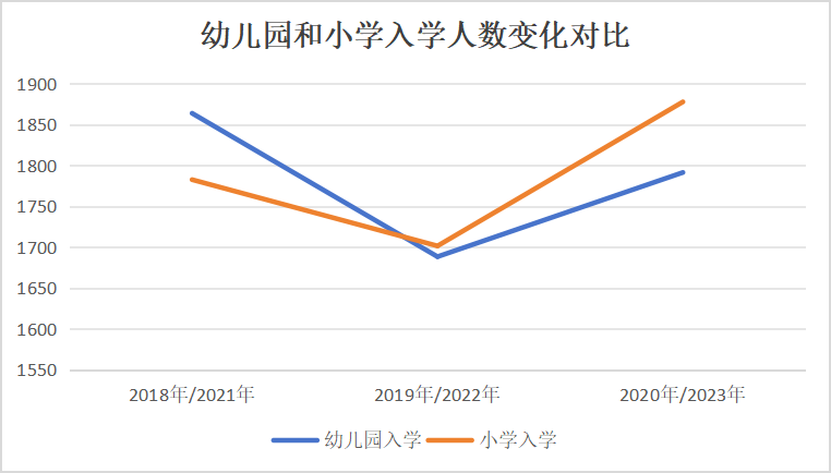 比如,2018年~2020年,幼儿园入园人数呈“V”形变化;随后的三年,也就是2021年~2023年,小学入学人数亦呈“V”形变化。