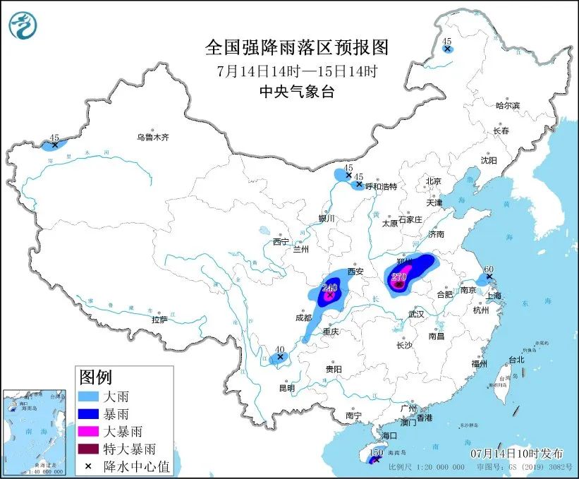 预计7月14日14时至15日14时,陕西南部、四川东部和南部、湖北北部、河南中南部、安徽北部、江苏南部及海南岛东南部、内蒙古河套地区等地部分地区有大到暴雨。