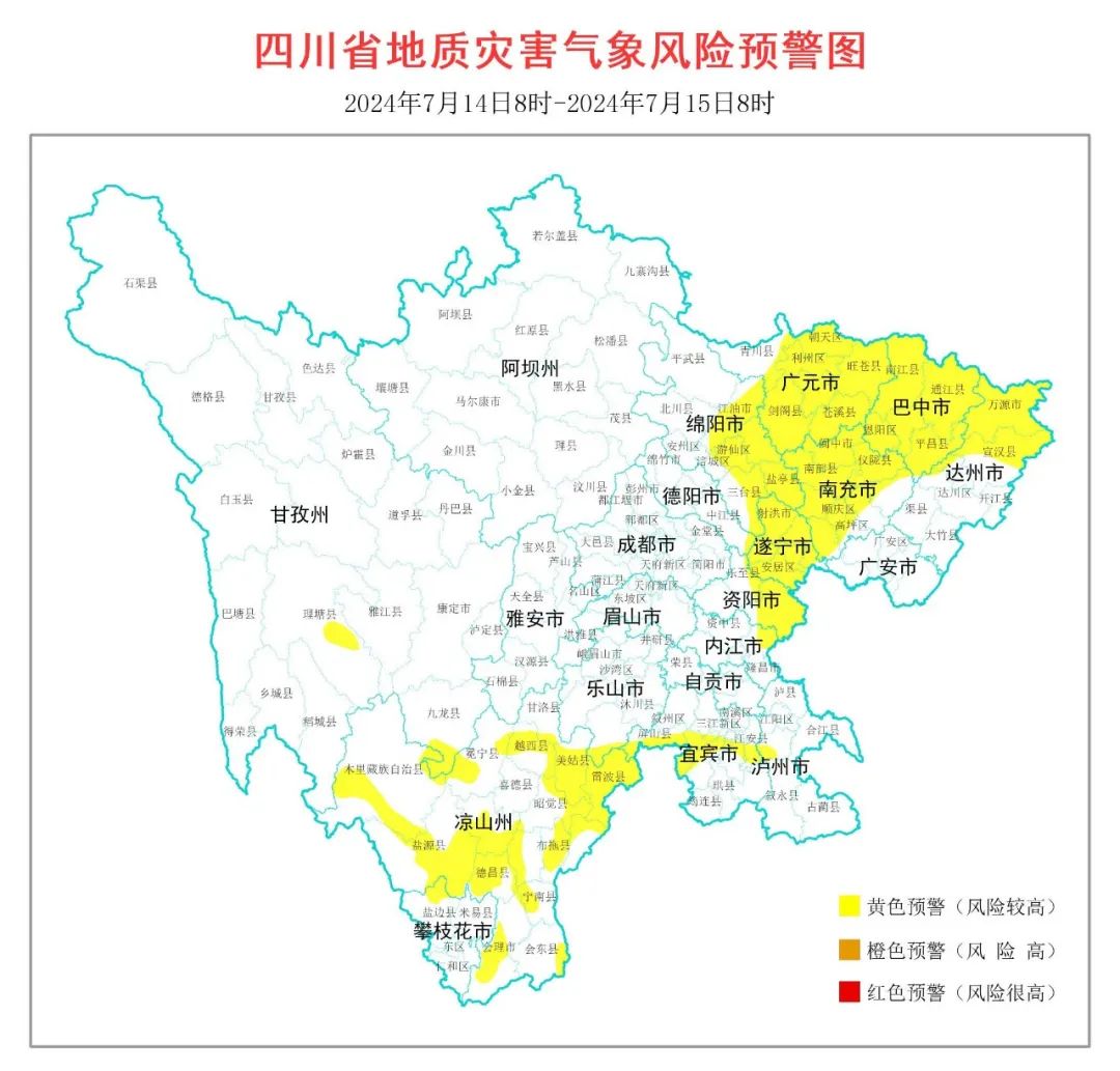 今日,四川省地质灾害防治指挥部办公室发布7月14日8时至7月15日8时全省地质灾害气象风险预警,涉15个市州71个县市区。具体如下: