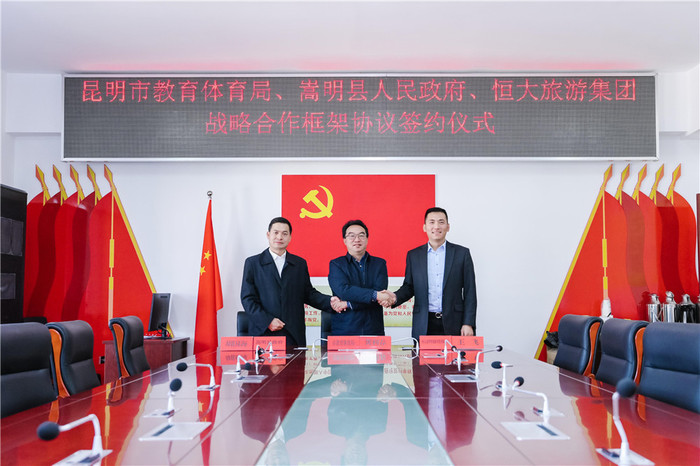 1月8日上午,昆明市教育体育局、嵩明县人民政府、恒大旅游集团云南公司三方在昆明市行政中心教体局举行隆重的战略合作框架协议签约仪式。本次签约标志着西南地区顶级优质教育资源中华小学、昆明市第三中学正式入驻昆明恒大文化旅游城,通过文化旅游产业和教育融合发展的有益探索和尝试,将有力推动当地教育事业的高质量发展。