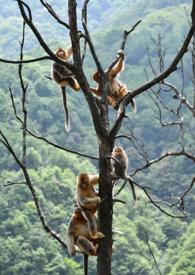 生活在裕河自然保护区的川金丝猴家族,在林间腾跃,幼猴金色的毛发在阳光下如流动的琥珀。