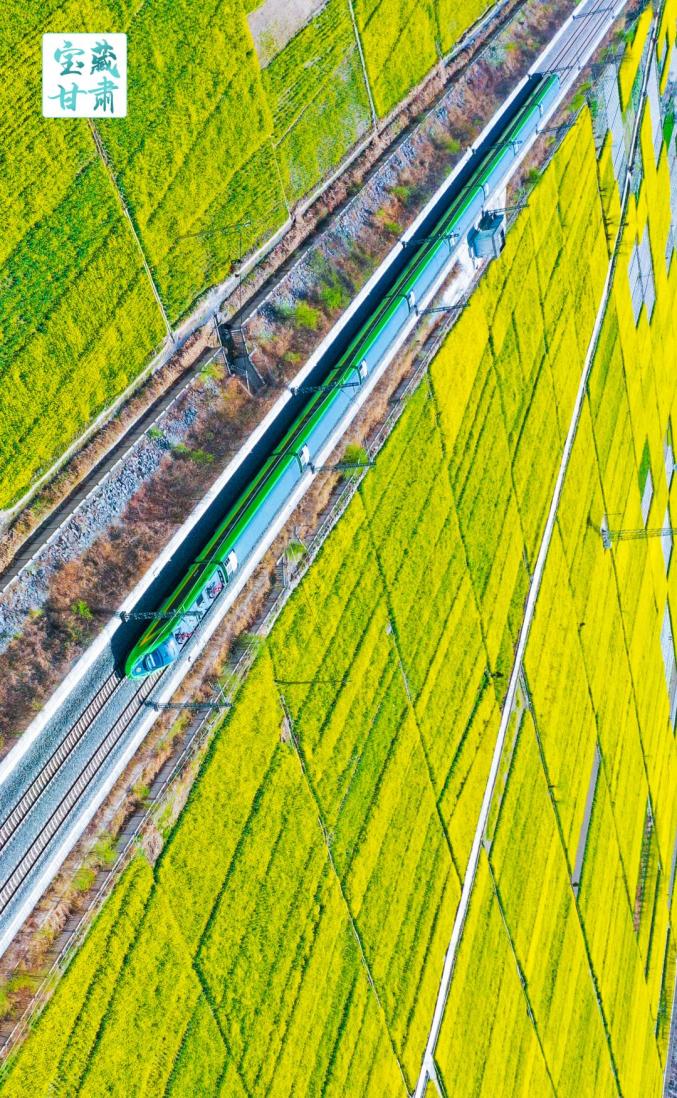 兰渝铁路线上,列车穿梭于金黄色的花海之中,为秦巴山地勾勒出一幅生机勃勃的春日画卷。
