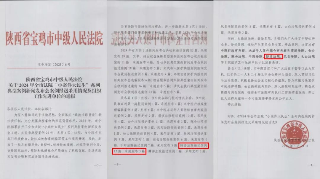 案例是人民法院的重要“法治产品”,权威、规范的案例能够统一法律适用标准、提高办案质效、增强人民群众对公平正义的获得感。近日,宝鸡市中级人民法院印发《关于2024年全市法院“小案件大民生”系列典型案例报送采用情况及组织工作先进单位的通报》,陇县人民法院获评“组织工作先进单位”。