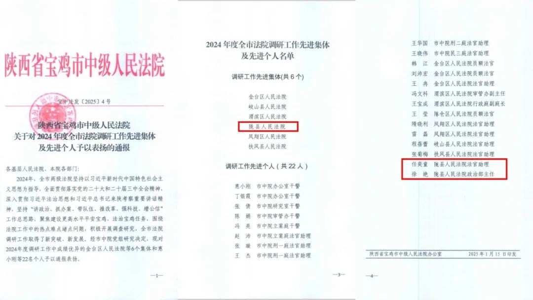 近日,宝鸡市中级人民法院印发《关于对2024年度全市法院调研工作先进集体及先进个人予以表扬的通报》,陇县人民法院获评“调研工作先进集体”,2名干警获评“调研工作先进个人”。