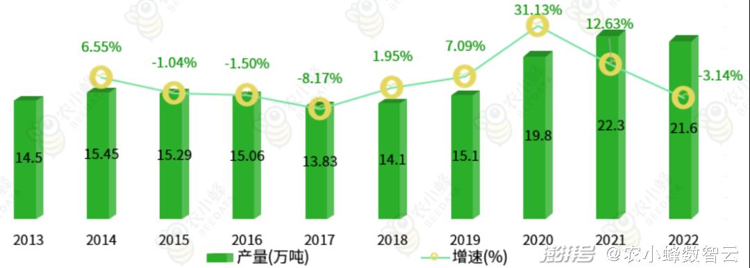 据国家统计局数据显示,2013年以来,甘肃省禽蛋产量呈现波动增长的趋势,2022年禽蛋产量达到21.6万吨,与2013年的14.5万吨相比,增长了7.1万吨,增幅约48.96%,年均复合增长率约4.53%;同比较2021年的22.3万吨减少了0.7万吨,降幅为3.14%。