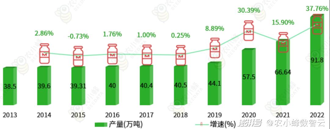 据国家统计局数据显示,2013年以来,甘肃省牛奶产量呈现波动增长的趋势,仅在2015年有过0.73%的下降。2022年,甘肃省牛奶产量达到91.8万吨,与2013年的38.5万吨相比,增加了53.3万吨,增长了1.38倍,年均复合增长率约10.14%;同比较2021年的66.64万吨增长25.16万吨,增幅为37.76%。