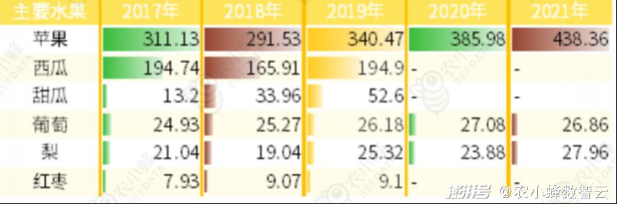据国家统计局和甘肃省统计年鉴数据显示,甘肃省水果产量位列前3的品类为苹果、西瓜、甜瓜。2021年甘肃省苹果产量438.36万吨,西瓜、甜瓜无2020和2021年统计数据,2019年西瓜、甜瓜产量分别为194.9万吨、52.6万吨。