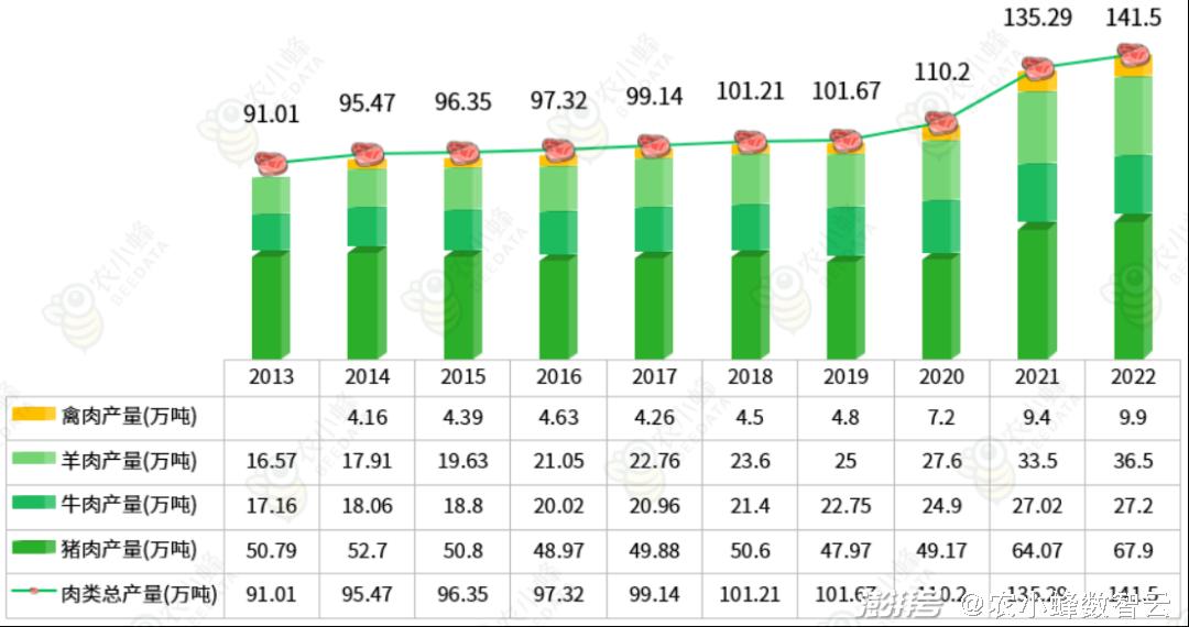 2013年以来,甘肃省肉类总产量以及细分的猪牛羊禽肉产量整体呈现波动增长态势,其中,羊肉产量增量相对较大(约20万吨),全省肉类产量结构也由2013~2014年的“猪肉>牛肉>羊肉>禽肉”变化为“猪肉>羊肉>牛肉>禽肉”。