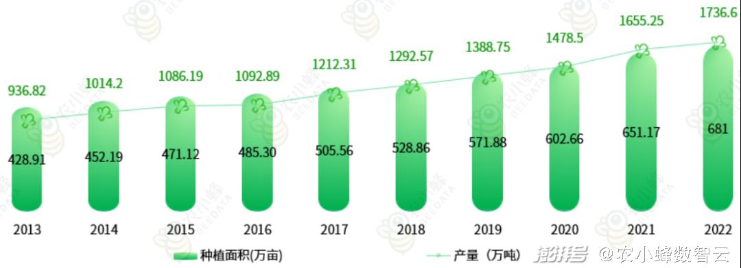 据国家统计局和甘肃省统计局数据显示:2013年以来,甘肃省蔬菜种植面积与产量均呈现波动增长态势,其中,种植面积在2022年达到最高值(681万亩);产量于2014年开始超过1000万吨,其后得益于种植面积的增加、单产水平的提升,2022年蔬菜产量接近1800万吨。