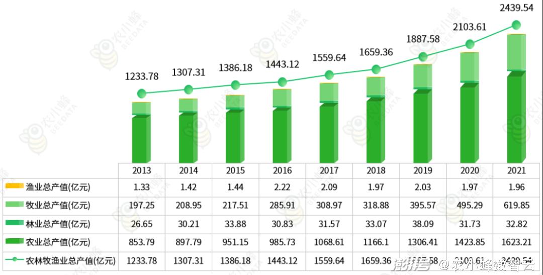 其中,农业总产值主要受蔬菜、水果等优势特色产业的拉动,近9年间增长了769.42亿元,增幅约90.12%,年均复合增长率约8.36%;牧业总产值在猪牛羊肉产业、乳业等发展的带动下,也由2013年的197.25亿元逐年增长至619.85亿元,近9年间增长了422.6亿元,增长了2.14倍,增幅最大,年均复合增长率约15.39%;林业、渔业总产值增速相对较缓,增幅也相对较小。在各细分产业增长的带动下,甘肃省农林牧渔业总产值由2013年的1233.78亿元,逐年增长至2021年的2439.54亿元,近9年间增量达1205.76亿元,增幅约97.73%,年均复合增长率约8.9%。