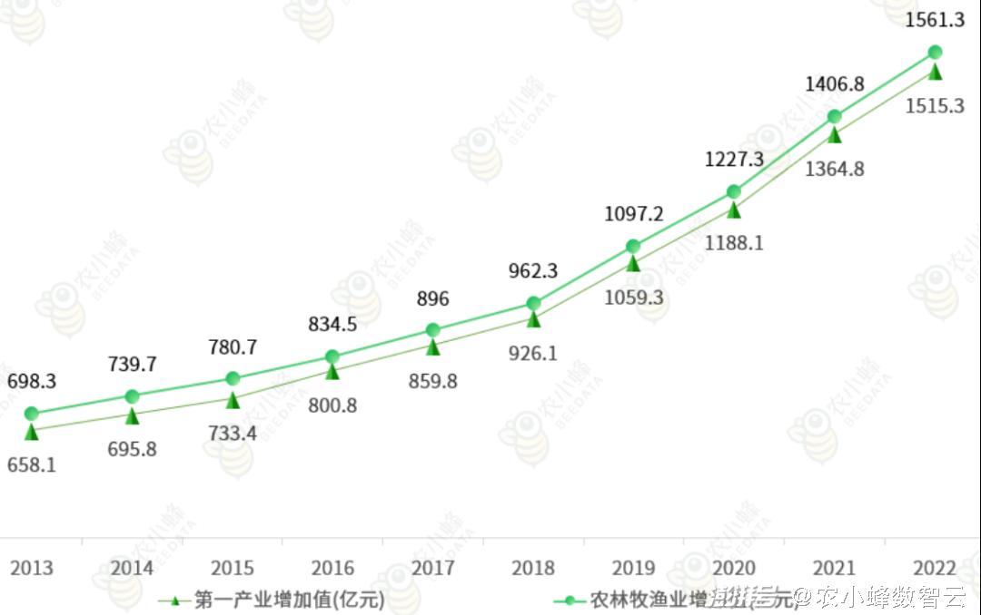 结合历史数据来看,2013年以来,甘肃省第一产业增加值、农林牧渔业增加值均整体呈逐年增长态势,结合指标定义来看,“第一产业增加值”是指按市场价格计算的一个国家(或地区)所有常住单位在一定时期内从事第一产业(即:农、林、牧、渔业)生产活动的最终成果;“农林牧渔业增加值”是指农、林、牧、渔及农林牧渔服务业生产货物或提供服务活动而增加的价值——2022年第一产业增加值、农林牧渔服务业增加值均达到历年最高值1515.3亿元、1561.3亿元,同比分别增长了11.03%,10.98%。
