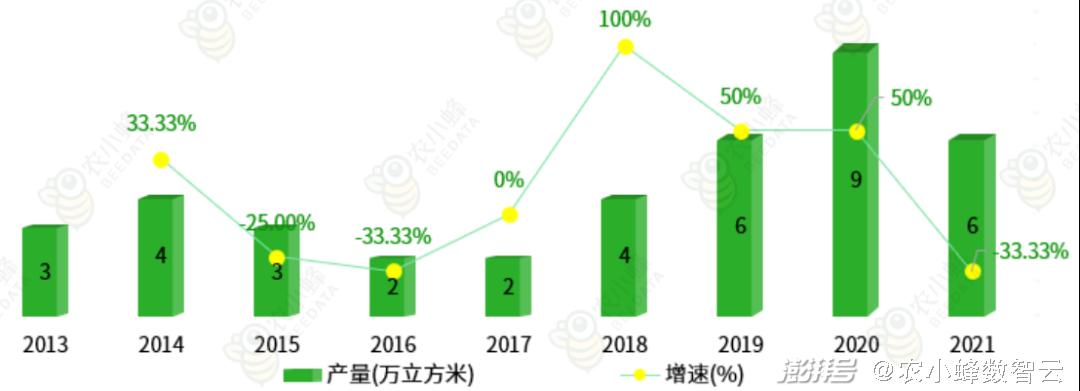 据国家统计局最新数据显示,2013年以来,甘肃省林产品主要有木材、生漆、油桐籽、五倍籽、棕片、竹笋片等。其中,生漆、油桐籽、五倍籽、棕片、竹笋片等林产品产量相关数据自2017年以来已陆续停止对外公布;木材产量呈现波动增长的趋势,2021年,甘肃省木材产量达到6万立方米,较2013年增长了3万立方米,增长了2倍,年均复合增长率约8%;较2020年减少了3万立方米,降幅为33.33%。因国家统计局没有统计更新其他林产品产量,本文仅做木材分析。