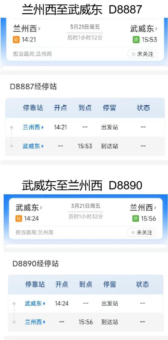 好消息!自2025年3月20日起,兰州西至武威东D8887/武威东至兰州西列车改为一站直达,通行时间缩短至1小时32分 ,轻松实现双城快速穿越。