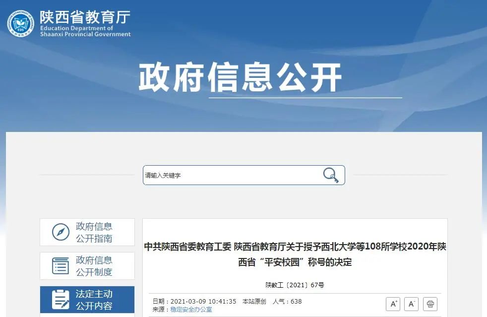 3月9日,省教育厅官网公布了2020年陕西省“平安校园”名单,其中包括陕西省“平安校园”复评认定的西北大学等6所高校和西安市莲湖区西关第一小学等创建申报的全省102所中小学幼儿园。