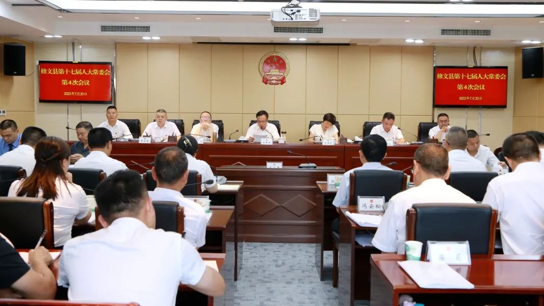 7月20日,修文县第十七届人大常委会第4次会议召开。县人大常委会主任王世利,县人大常委会副主任胡祥碧、林江、李继彬、李红雨、项江、刘春祥出席会议。受县人大常委会主任王世利委托,会议由县人大常委会副主任李继彬主持。
