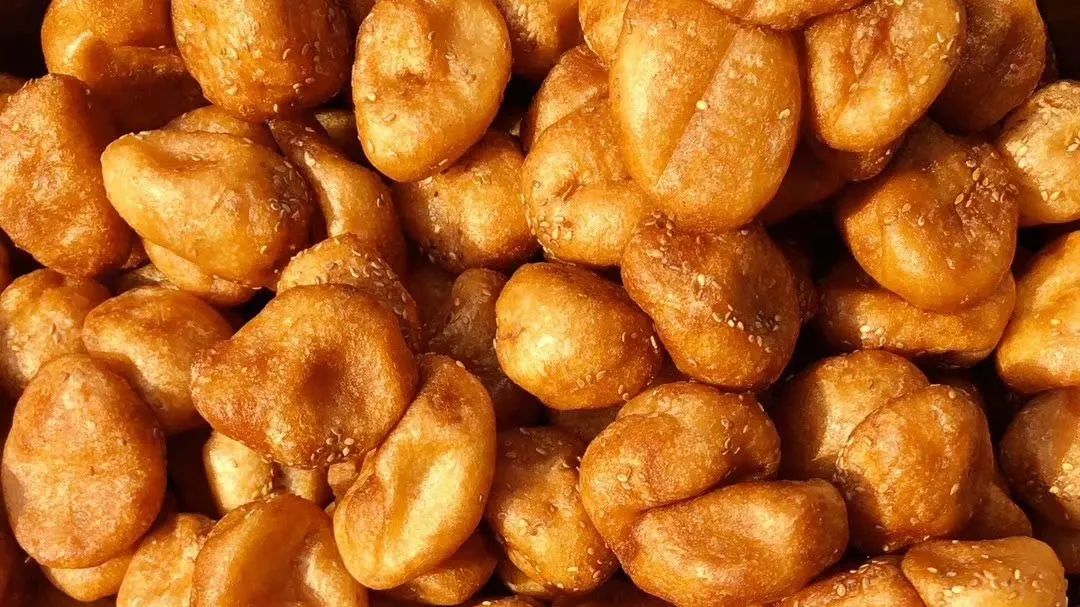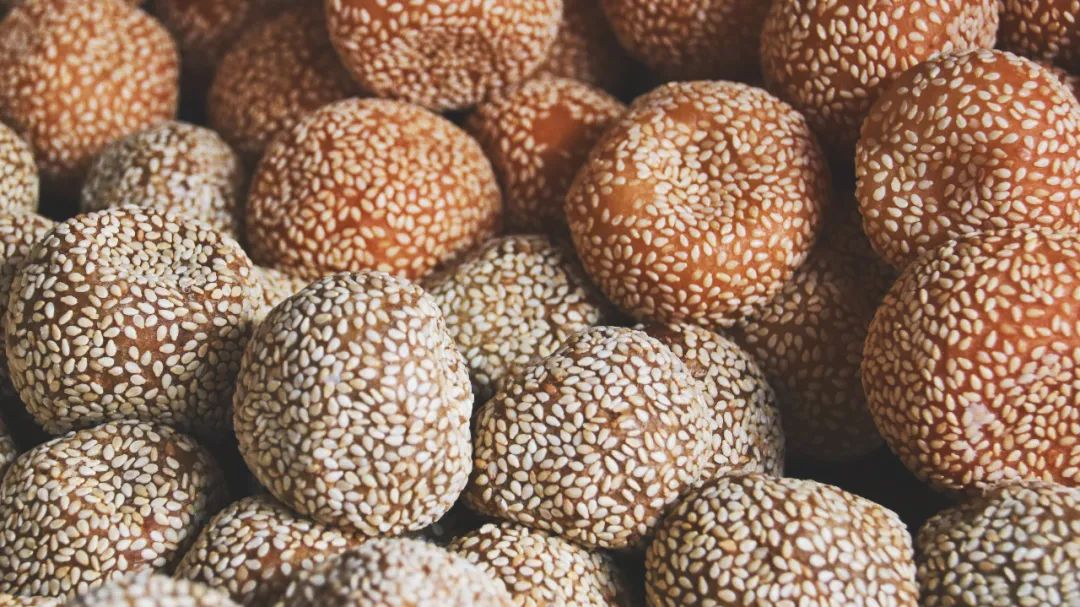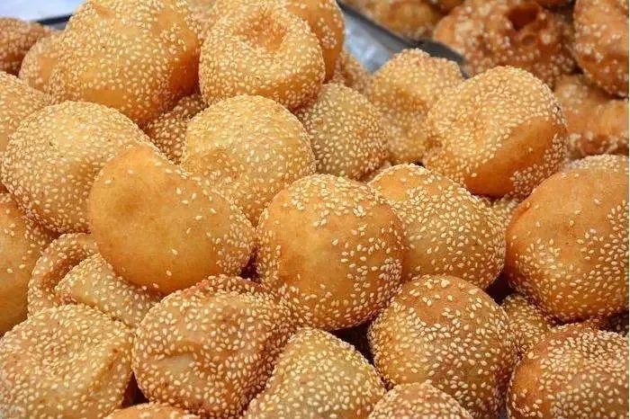 煎圆又叫煎堆,是用糯米粉加糖、芝麻等,放到锅里用油煎成。色泽金黄,外形浑圆中空,口感芳香酥脆,体积膨大滚圆,表皮薄脆清香,内里柔软粘连,又香甜可口。有团圆、甜蜜的寓意。