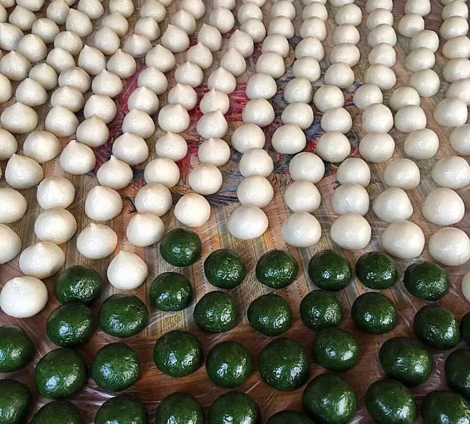 无锡等地的居民喜欢过年吃团子,寓意团团圆圆,阖家欢乐。揉米粉、弄馅心、搓团子,一个个糯米做出来的团子晶润柔软,白色的米团子蘸上白糖,香糯甜蜜。草绿的团子自带夹心,有时是象征美好的特殊馅料,吃到的人也意味着自带一整年的好运气。