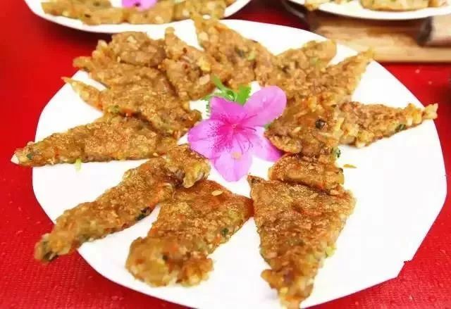 这是一道最具山城特色的风味小吃,也是泰顺酒宴上一道老少皆宜且又必备的菜肴。一道香气四溢、令人垂涎且名闻遐迩的薄饼需要众多细心的小工序。成品通体金黄色,一口咬下去,香脆的外皮搭配上里面多汁的馅料,入口便是一阵香,真的是一种无法抵挡的诱惑。