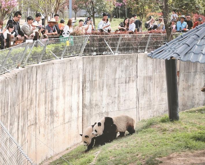 四月六日,在西安市周至县的秦岭四宝科学公园,憨态可掬的大熊猫吸引众多游客观赏。