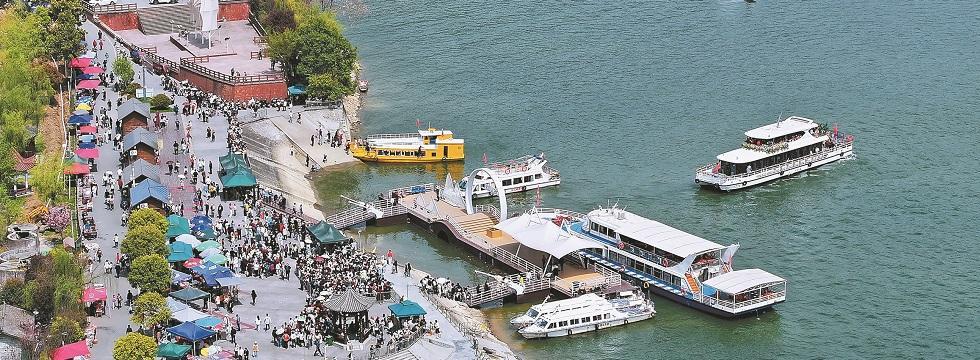 清明假期,石泉县景区人流如织。图为4月5日,游客在石泉县后柳水乡排队乘坐游船。