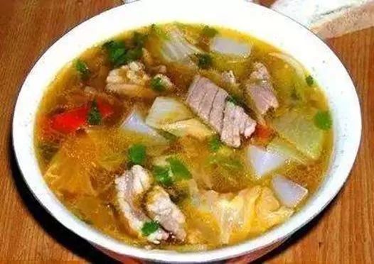 粉汤,将凉粉切成方形薄片,加杂烩、丸子、鸡肉、酥肉、肉片等,为定西民间常见待客食品。惟独定西人叫“粉汤”。因为它拥有周边各县饮食中所缺乏的独特主角——“杂烩”,显示了它独具的特色。