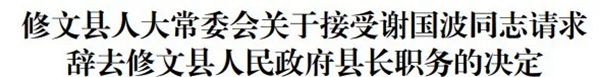 修文县第十七届人大常委会第25次会议,审议了《修文县人大常委会主任会议关于接受谢国波同志请求辞去修文县人民政府县长职务的议案》,根据《中华人民共和国地方各级人民代表大会和地方各级人民政府组织法》第三十二条的规定,决定接受谢国波同志辞去修文县人民政府县长职务,并报修文县第十七届人民代表大会第四次会议备案。