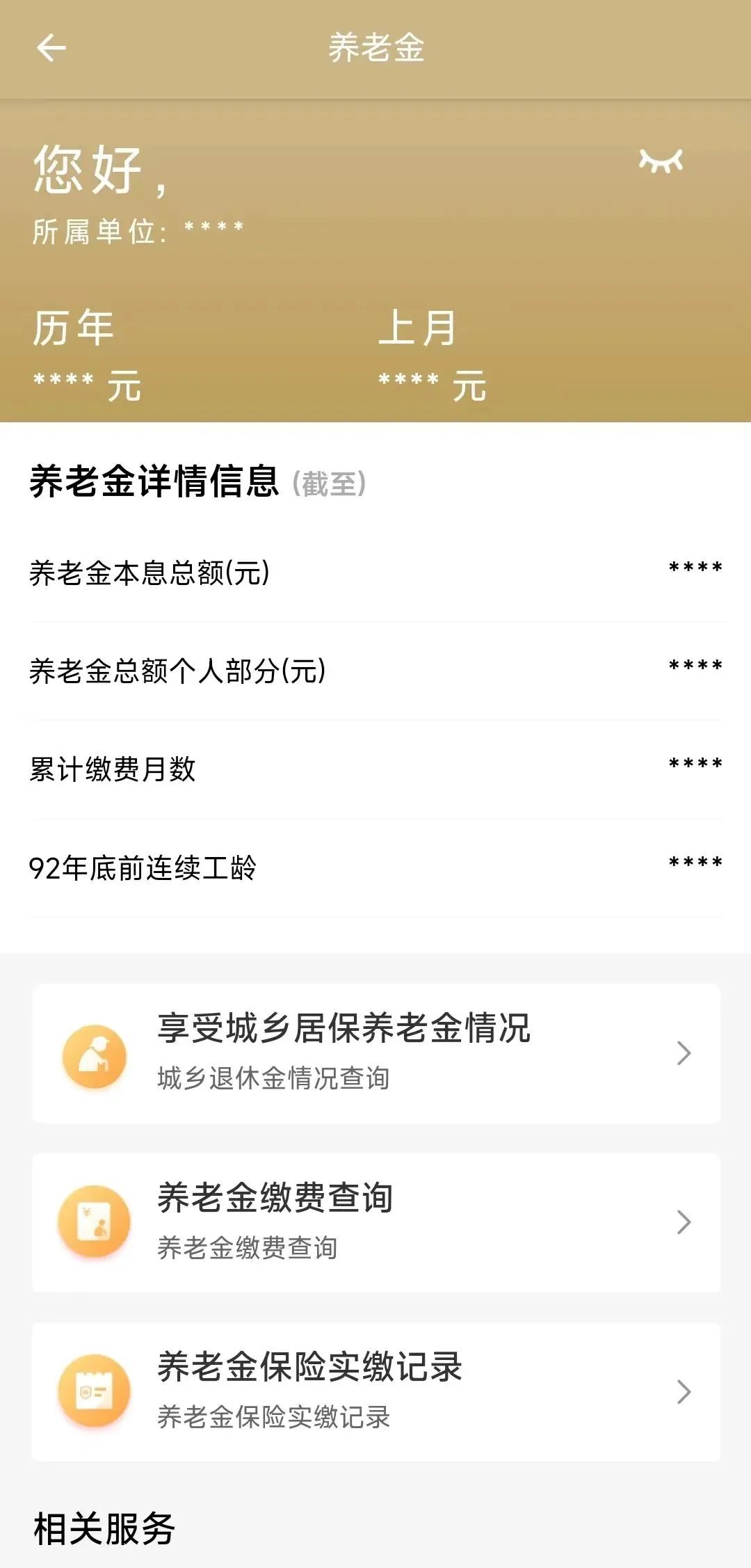 养老金详情:点击查看详情后,可查看养老金历年、上月、本息总额、累计缴费月数等详细信息。