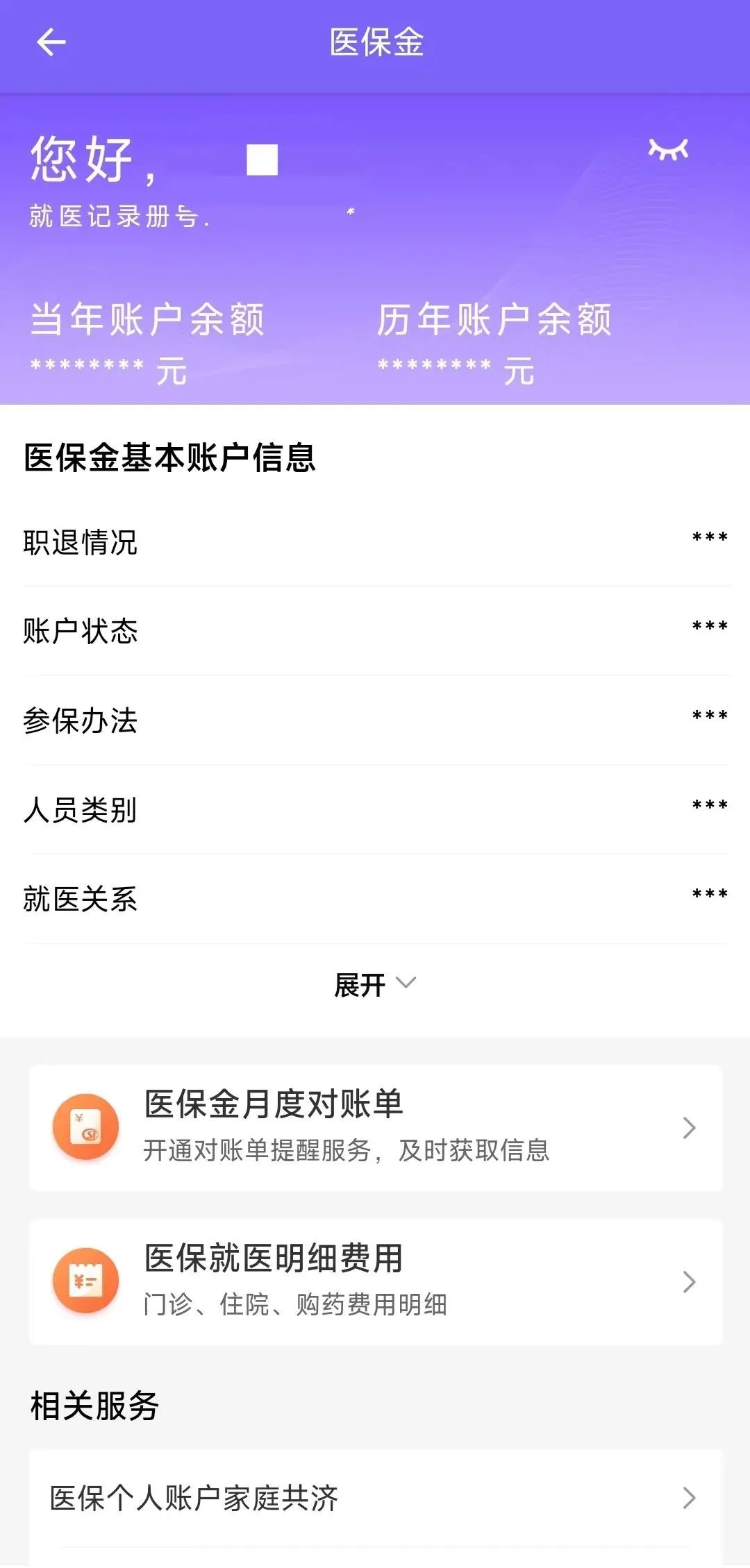 医保金详情:点击查看详情后,可查看当年账户余额、历年账户余额、基本账户信息等详细内容。