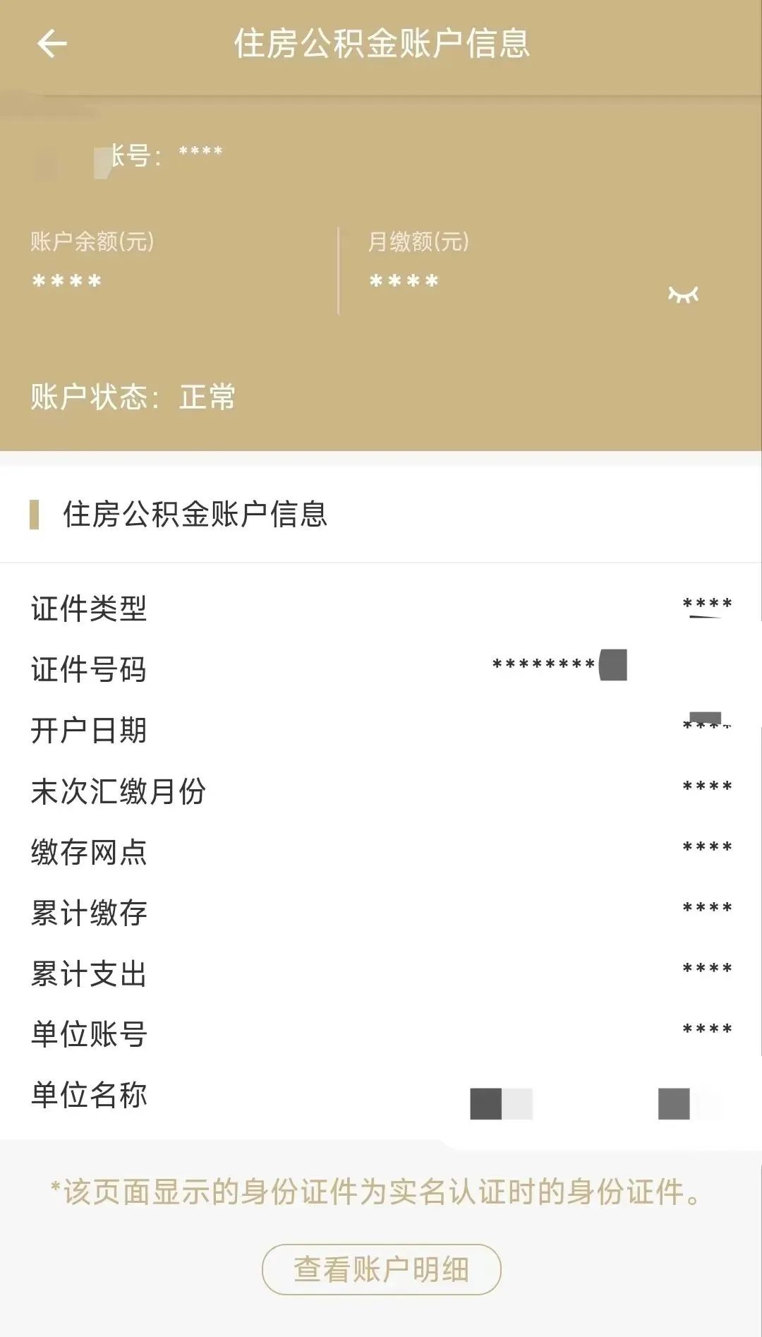 住房公积金详情:点击查看详情后,可查看住房公积金账户信息、账户余额、月缴费额等信息。