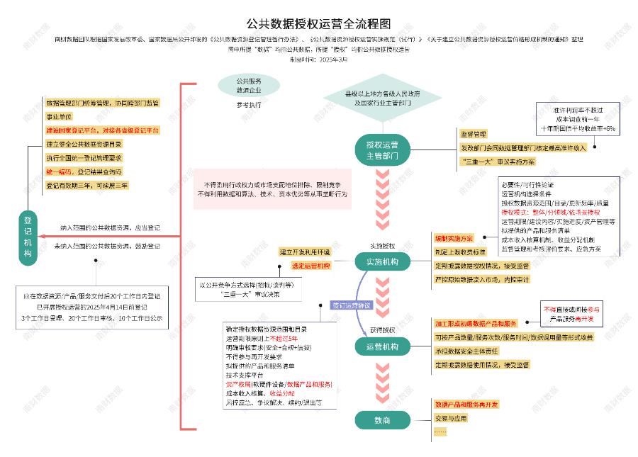 为清晰掌握当前公共数据授权运营的实施体系,南财数据团队梳理了可视化的“1+3”政策全流程图。可以看出,在国家顶层设计所擘画的公共数据授权运营流程中,主管部门、实施机构、运营机构、登记机构、数商是关键节点,授权模式、协议签订是关键步骤。公共数据从政府一级一级流向事业单位、国有企业、公共市场,实现数据价值开发和安全保护的平衡。